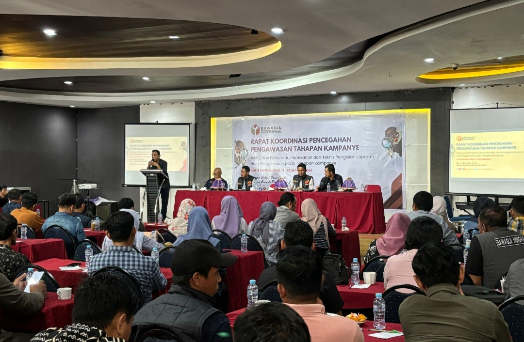 BONE–Dalam rangka meningkatkan efektivitas pengawasan selama tahapan kampanye Pemilihan Kepala Daerah, Badan Pengawas Pemilu (Bawaslu) Kabupaten Bone menyelenggarakan Rapat Koordinasi (Rakor) Pencegahan Pengawasan Tahapan Kampanye. Acara ini digelar selama dua hari, Sabtu dan Minggu, 12-13 Oktober 2024, di Hotel Novena Bone. Kegiatan tersebut bertujuan menyamakan pemahaman di antara jajaran Panwaslu Kecamatan se-Kabupaten Bone terkait Pemetaan Kerawanan dan teknis pengisian laporan hasil pengawasan.