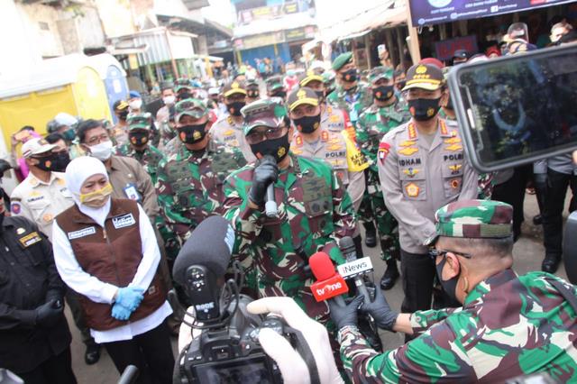 Malang, zonanusantara.com– Panglima TNI Jenderal Marsekal Hadi Tjahjanto mengakui pedagang di pasar, sudah menjalankan protokol kesehatan dengan baik. Hal ini ia ungkapkan saat bersama Kapolri Jenderal Pol Idham Azis, Gubernur Jawa Timur, Khofifah Indar Parawansa, mengunjungi Pasar Singosari, Malang, Sabtu (20/6).