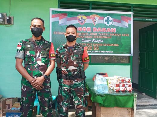 KEFAMENANU,- Satuan Tugas Pengamanan Perbatasan (Satgas Pamtas) RI-RDTL Yonif 743/PSY, menggelar donor darah dalam rangka HUT Kodam IX/Udayana ke-69 di Pos Kalan Desa Fatumuti, Kecamatan Noemuti, Kabupaten Timor Tengah Utara, Rabu (25/5)